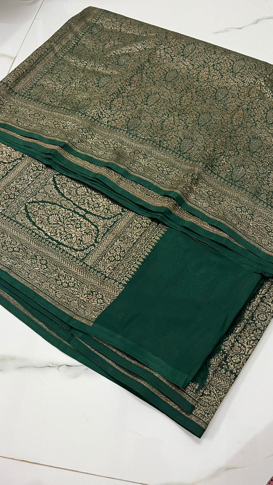 Introducing our Banarasi Crepe Saree, made from Banarasi Khadi crepe, renowned for its luxurious drape and elegant designs. Ideal for special occasions and gatherings, this saree combines traditional craftsmanship with modern sophistication. Experience the beauty and comfort of Banarasi crepe - a must-have addition to any wardrobe.